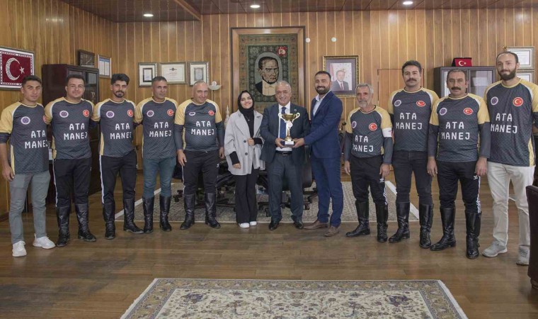 Müsabaka sonrasında Atatürk Üniversitesi Rektörü Prof. Dr. Ömer Çomaklı’yı ziyaret eden Manej Alanı ve Atçılık Koordinatörü Doç. Dr. Gökhan Öztürk ve kulüp sporcuları, kazanılan kupayı Rektör Çomaklı’ya takdim etti.