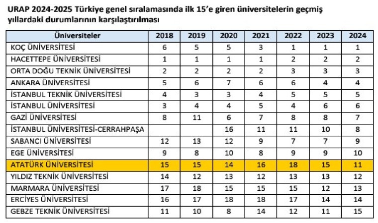 University Ranking by Academic Performance Laboratuvarı (URAP), 2024-2025 dönemine ilişkin Türkiye’nin en iyi üniversiteleri sıralamasını açıkladı. Buna göre Atatürk Üniversitesi; Devlet Üniversitelerinin yer aldığı sıralamada 9, vakıf üniversitelerinin bulunduğu sıralamada ise 11. sırada yer alarak “En İyi Üniversiteler” arasında yer almaya devam ediyor.