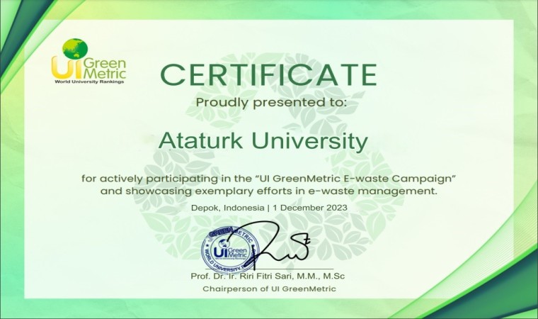 Üniversite kampüslerindeki sürdürülebilirlik çabalarını dünya çapında değerlendiren ve karşılaştırmasını yapan Green Metric tarafından yayımlanan UI GreenMetric E-Atık Sıralamasında Atatürk Üniversitesi de yer aldı ve 1183 üniversitenin değerlendirildiği araştırmada sadece 57 üniversitenin yer aldığı listeye girme başarısı gösterdi.