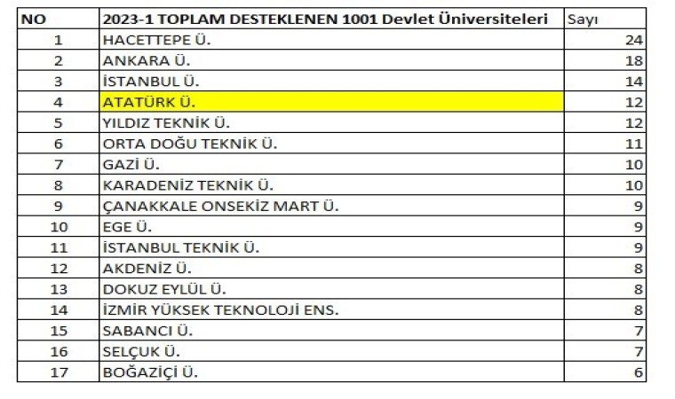 2023 yılı 1. döneminde "1001-Bilimsel ve Teknolojik Araştırma Projelerini Destekleme Programı" kapsamında sunulan ve bir sonraki dönemi beklemeden tekrar başvuru yapılmasına imkân sağlanan projelerin değerlendirilmesi sonucunda Atatürk Üniversitesi, dikkat çekici bir sonuca imza attı.