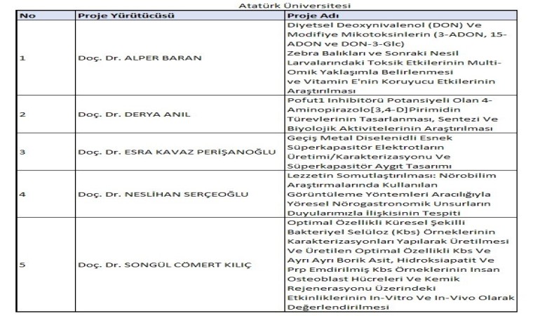 Değerlendirme sonuçlarına göre; Atatürk Üniversitesinden toplamda 5 öğretim üyesinin sunmuş olduğu projeler desteklenmeye layık görülürken, geliştirilebilir projeler arasında projeleri en çok desteklenen 2. üniversite olma başarısı da gösterdi.