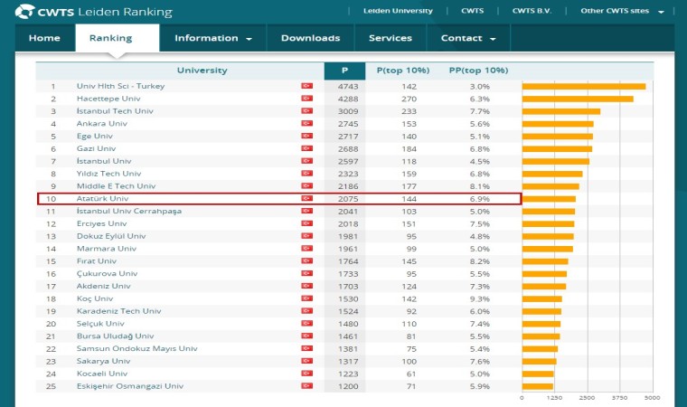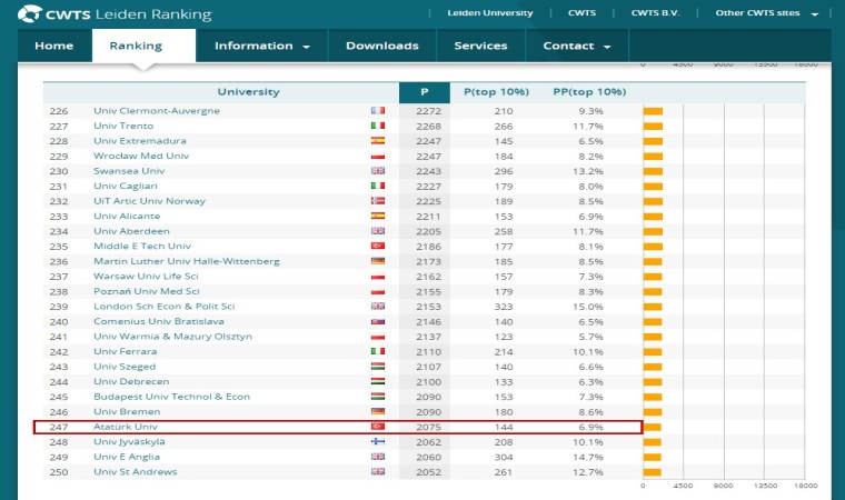 Üniversitelerin bilimsel performanslarına ilişkin önemli bilgilerin paylaşıldığı rapora göre Atatürk Üniversitesi; Türkiye’den listeye girme başarısı gösteren 40 üniversite arasında 10. sırada yer alırken, dünyanın önde gelen 1506 üniversite arasında 785. sırada yer alarak ilk 500 üniversite arasına girme hedefine emin adımlarla ilerlediğini bir kez daha gösterdi. Ayrıca Atatürk Üniversitesi, Avrupa Üniversiteleri arasında 247. sırada yer alarak önemli bir başarının altına imza attı.Alan bazlı taramalarda daha da başarılı bir grafik çizen Atatürk Üniversitesi; Biyomedikal ve Sağlık Bilimlerinde Dünya genelinde 613, Türkiye’de 11, Yaşam ve Yer Bilimlerinde Dünya genelinde 558, Türkiye sıralamasında 5; Fizik Bilimleri ve Mühendislik Alanında ise Dünya genelinde 700 ve Türkiye sıralamasında 6. sırada yer aldı.