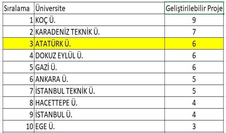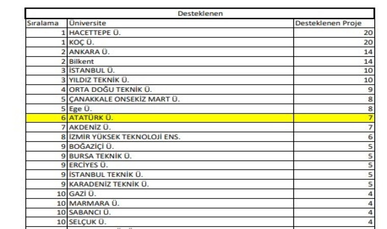 Bir sonraki dönemi beklemeden başvuru yapılabilmesine karar verilen projeler arasında tüm üniversiteler arasında Atatürk Üniversitesi 3. sırada yer aldı. Bu bağlamda Su Ürünleri Fakültesi Su Ürünleri Yetiştiriciliği Bölümü Öğretim Üyesi Prof. Dr. Murat Aslan, Veteriner Fakültesi Gıda Hijyeni ve Teknolojisi Bölümü Öğretim Üyesi Doç. Dr. Alper Baran, Teknik Bilimler Meslek Yüksekokulu Kimya ve Kimyasal İşleme Teknolojileri Bölümü Öğretim Üyesi Doç. Dr. Derya Anıl, Fen Fakültesi Fizik Bölümü Öğretim Üyesi Doç. Dr. Esra Kavaz Perişanoğlu, Turizm Fakültesi Gastronomi ve Mutfak Sanatları Bölümü Öğretim Üyesi Doç. Dr. Neslihan Serçeoğlu ve Diş Hekimliği Fakültesi Klinik Bilimler Bölümü Öğretim Üyesi Doç. Dr. Songül Cömert Kılıç’ın projeleri, bir sonraki dönem beklemeden sunulmaya hak kazandı.