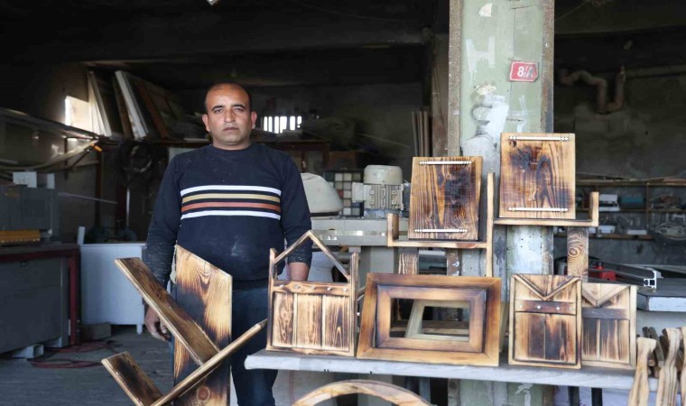 Hatay’ın Kumlu ilçesinde yaşayan depremzede Mehmet Aslan, atık ahşap malzemeleri sanata dönüştürerek para kazanıyor.