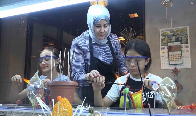 Çevrelerinden ve evlerinden topladıkları atık gazoz, soda ve ilaç şişelerini şalümoların ateşinde eriten genç kursiyerler, daha sonra şekillendirdikleri cam parçalarını fırına koyuyor. Bileklik, yüzük, kolye, tabak, saat ve nazar boncuğu gibi çeşitli süs eşyaları üreten genç kursiyerlerin yaptığı birbirinden güzel el emeği ürünler adeta göz kamaştırıyor. Gaziantep Büyükşehir Belediyesi Çocuk Sanat Merkezi Birim Koordinatörü Zeliha Ağtaş, merkezdeki cam atölyesinde eğitimlerini tamamlayan genç yeteneklerin, atık cam şişeleri ve cam çubukları kısa bir sürede kolaylıkla takı ve diğer süs eşyalarına dönüştürebildiğini söyledi. Öğrencilerin merkezde özel olarak hazırlanan atölyelerde alanlarında profesyonel olan eğitmenlerin sayesinde kendilerini geliştirerek birbirinden güzel el emeği ürünler yaptıklarını belirten Ağtaş, 7-16 yaş aralığındaki çocukları merkezdeki kurslara katılmaya davet etti.