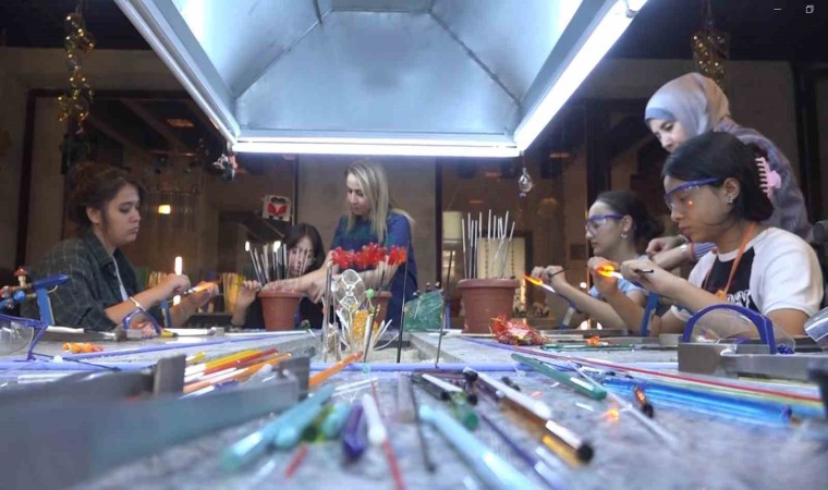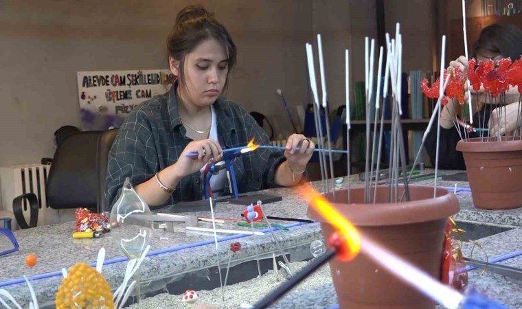 Gaziantep’te Kültür ve Sanat Merkezi’ne dönüştürülen eski adliye binasında kurulan cam atölyesinde genç yetenekler, atık cam şişeleri ve ince cam çubukları bin derece sıcaklıkta erittikten sonra çeşitli aşamalardan geçirerek birer sanat eserine dönüştürüyor.
