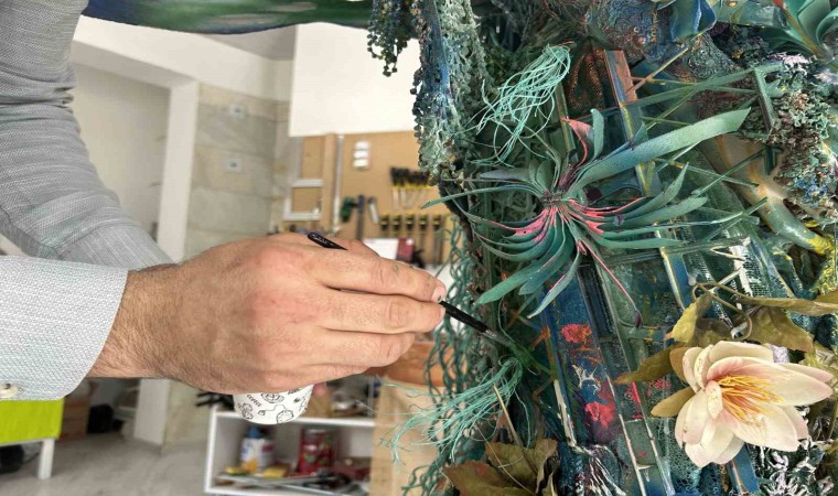 “Dolap kapağı, ağaç kasası, plastik şişeler, vitrin mankenleri, denize atılmış ipler, kumaşlar, portakal kasaları, çöp kovaları ve çeşitli gemilerden atılan ipler kullanıldı. Toplama aşaması biraz uzun. Üretim aşamasında da bunlar parçalanıyor ve daha küçük hallere getiriliyor. Sonra iskelet halinde kurulup birleştiriliyor. Sıfır malzeme kullanılmadı. Çalışmayı Karşıyaka Belediyesi işbirliği ile gerçekleştiriyoruz.”
