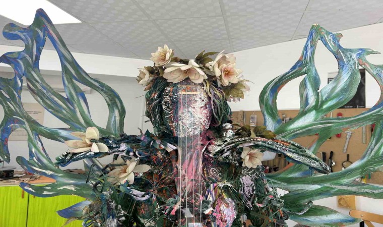 Karşıyaka Belediyesi Mahmure Handan Hanım Müzik Aletleri Yapım Atölyesi’nde yaklaşık 4 aylık bir süre içerisinde yapılan ‘çello’ heykeli, Türk mitolojisindeki ‘umay’ figüründen esinlenildi. Kömür, patates çuvalı, halat ipi, plastik kasa, baza altı, mobilya dolap kapağı ve abiye kumaş atıklarından yapılan heykelin iskeleti ise pencere kasasından oluşuyor.