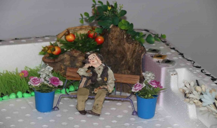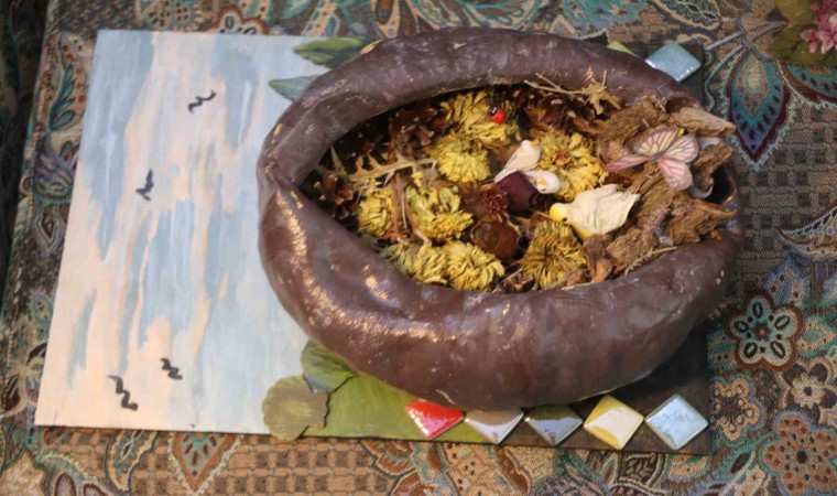 Eski plastikleri, metal parçaları, karton kutuları ve diğer atık malzemelerin hepsini 10 metrekarelik atölyesinde bir araya getiren Macit, hünerli elleriyle bunları şekillendirerek ortaya sıra dışı tasarımlar çıkarıyor. Farklı dokudaki birçok malzemeyi kullanarak hayal gücüne göre sanat eserine çevirdiğini ifade eden Macit, “Her türlü atık malzeme sanat eserine dönüşebilir. Küçüklükten beri bunları yapardım. Bahçemizin etrafındaki çalıları kesip şiş yaparak örgü örerdim. Babama ait boyaları alıp, kesilen odun parçalarını boyar süs eşyaları üretirdim. Okul sıralarında da boş durmadım. Ancak liseye geldiğimizde sanatı seçtim. Orada tabi bu tür şeyleri yapmadık. Daha çok nakış, dikiş, örgü, bebek yapımı ve yemek yaptık. Evdeki eşyaları daha aktif olarak kullanmak üzere dönüştürmeye başladım. Mesela tencereden saat yaptım. Kütükleri bahçelerden bulup getirdim. Hepsinin içini temizledim. Vernikledim. İçlerine çiçekler yerleştirdim. Bahçelerden mısır koçanları toplayarak, onlarla bebekler yaptım. Lahana ve kabakları kuruttum, süs eşyaları yaptım. İnşaat atıkları, borular, parkeler, demirler bana malzeme oldu. Çimento, derz alçı bunların hepsini karıştırarak değişik şeyler yaptım. Vazo, testi, bardak, çiçeklik bunlar büyüdükçe büyüdü. Bugüne kadar binin üzerinde eser yaptım. Aile ekonomime hiç katkısı olmadı. Hediyeleşmeyi çok seviyorum. Yaptıklarımı görsünler istiyorum. Herkese göstermek istedim. Görenler ‘bunu neden sanata dökmüyorsun, ailene neden katkı olarak kullanmıyorsun’ diyenler oldu. Benim imkanım olmadı. Bunları sadece hayal gücümle yapıyorum. İçimde bir yapma arzusu var. Yapmadan duramıyorum. Evde kırılan hiçbir malzemeyi atmıyorum. Onu nasıl değerlendirebilirim diye bir köşede bekletiyorum” diye konuştu.