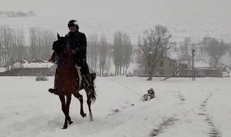 Erzurum’un Yakutiye ilçesine bağlı Dumlu Mahallesinde at çiftliğinde karı eğlenceye dönüştürdüler.
