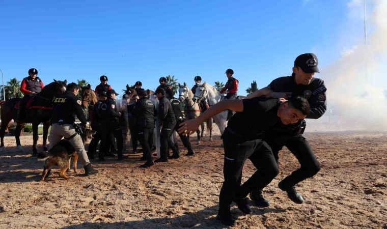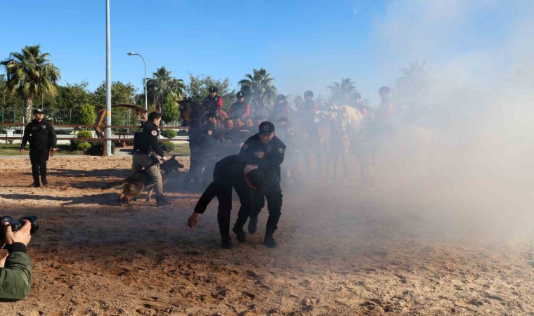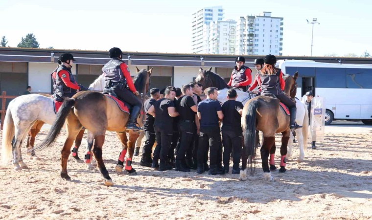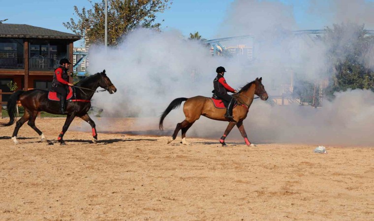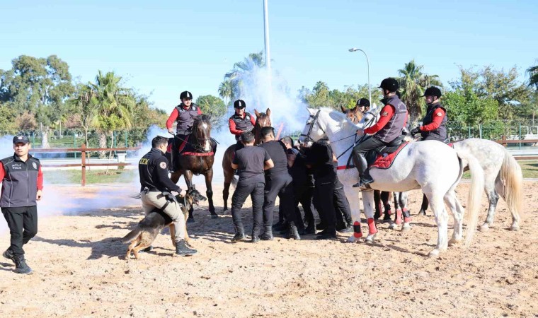 Adana’da atlı polisler, toplumsal olaylara müdahale tatbikatı ile gruba müdahale hızında şov yaparak etkilerini gösterdi.