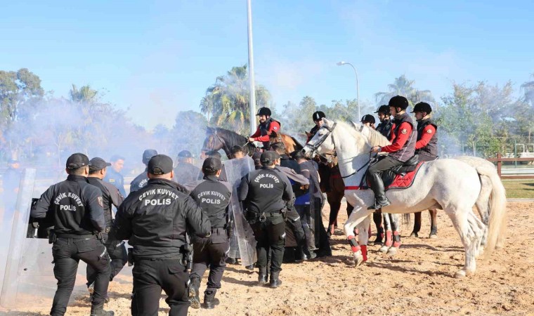 Atlı Birlik Grup Amirliğinin yerleşkesinde toplumsal olaylara müdahalenin tatbikatı yapıldı. Nefes kesen tatbikatta, ellerindeki çeşitli maddeleri atarak, gösteri yapan gruba atlı polisler müdahale etti. Senaryo gereği sis ve ses bombası atılan alanda atlı polislerin gruba müdahale tatbikatı gerçeğini aratmadı. Köpek Eğitim Merkezi’nden gelen asayiş devriye köpeği Leon da tatbikatta atlı polislere destek verdi. Grubu çembere alıp dağıtan ekipler, gösteri düzenleyen kişileri gözaltı koridorundan geçirdi. Tatbikatta gerçeğini aratmayan görüntüler ortaya çıktı.