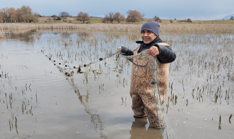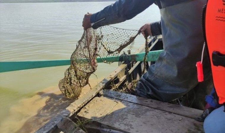 Konya’nın Beyşehir ve Ilgın ilçelerinde, su ürünleri av yasağına rağmen göl sularına kaçak avlanmak amacıyla serilen balıkçı ağları ve pinterler toplanıyor.