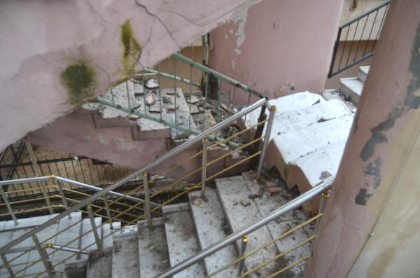 Denizköşkler Mahallesi Altuner Sokak'taki 5 katlı binanın arka cephesindeki yoldan 3'üncü kata geçişi sağlayan merdiven sabah saat 07.00 sıralarında gürültüyle çöktü. Olay yerine itfaiye ve polis ekiplerinin yanı sıra sağlık ekipleri de sevk edildi. Binanın girişine emniyet şeridi çekilerek güvenlik önlemi alındı. Merdivenlerin bir bölümünün yıkılmasının ardından 3 basamağı havada asılı kaldı. Havada asılı kalan basamaklar itfaiye ekipleri tarafından beton kesme makasıyla kesildi. Sıvaları dökülen, demirleri açıkta duran binada yaşayan yabancı uyruklu 10 kişinin kaldıkları daireye aylık 600 dolar kira ödedikleri öğrenildi.