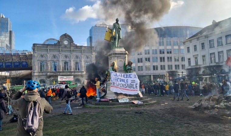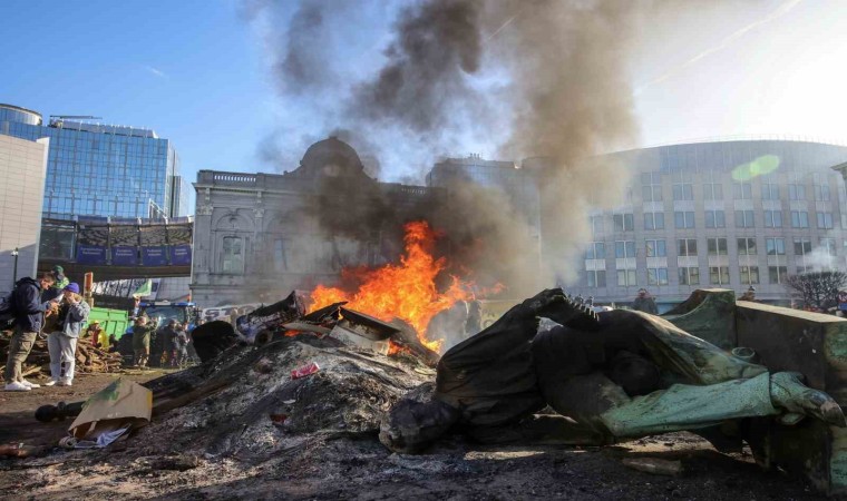 Avrupa Birliği’nin (AB) tarım politikalarına karşı Brüksel’de gösterilerini sürdüren çiftçiler, Avrupa Parlamentosu (AP) binasının önünde döktükleri tezek, odun ve saman balyalarını ateşe verdi.