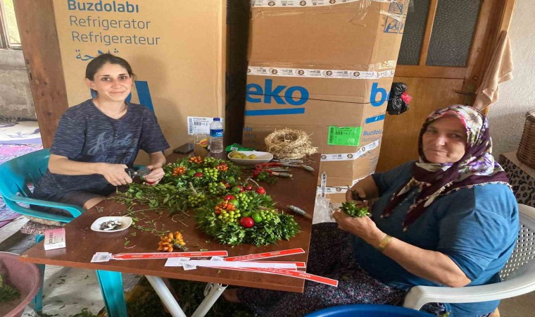Melli kapı süslemeleri üretim sorumlusu Ulaş Aktürk, "Her sezon olduğu gibi 20 Ağustos’ta çelenk üretimine başladık. Sabah 8-9 gibi meyveleri 10 civarı eve tek tek dağıtıyoruz. Öğleden sonra da çelenk olarak topluyoruz. Bu çelenkleri depoya getirip burada paketliyoruz. Sonra tır geliyor direkt Hollanda ve Almanya’ya ihraç ediyoruz. Dışarıya gönderdiğimiz çelenkleri genelde kapı süsü olarak birbirlerine hediye götürüyorlar veya mezarlıklara koyuyorlar. 2023 yılında 450-500 bin civarı çelenk gönderdik. Bundan da 2 milyon 500 bin euro civarında bir ciro elde ettik. Bu yıl yine 500 ile 550 bin civarında çelenk göndermeyi hedefliyoruz. Bundan da 4 milyon 500 bin euro civarında bir ciro elde etmeyi planlıyoruz. Kadınlarımızı genelde günde kişi başı 25-30 tane yaparlar. Halkımız için iyi bir gelir kaynağı. Çelenkte kullanılan süs biberi ve süs patlıcanını diktiriyoruz oradan alıyoruz. Dağ çileği ve tespih dediğimiz meyveleri vatandaşlar ormandan toplayıp getiriyorlar. Antalya civarından gelen meyveler var. Yani köyümüzde eşleri dışarıda çalışırken ev hanımları da evinde böyle bir gelir kaynağı elde ediyor" ifadelerine yer verdi.