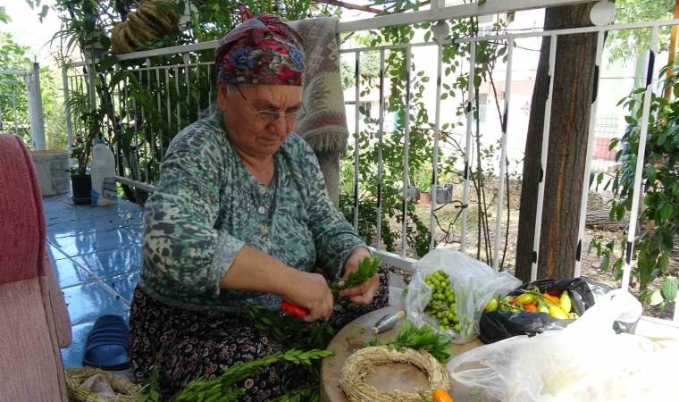Evinde annesi Dudu Duran ile birlikte bir yandan Ekim ayında olacak düğünü için hazırlık yapan bir yandan da Melli kapı süslemesi yapan Dilek Duran, “Biz bu süslemelerde kuşburnu, biber, patlıcan, mersin gibi bitkileri kullanıyoruz. Günde yaklaşık 30-35 kadar süsleme hazırlıyoruz. Psikolojimize göre değişiyor. Bir gün önceden ertesi günün hazırlığını yaptıysak daha hızlı oluyor ama sıfırdan sabah başlayınca biraz zor oluyor. Her gün saat 16.00’ya kadar yapıyoruz böyle. Bu süslemeler 3-4 ay boyunca yapılıyor böyle. Ağustos’un 20’si gibi başlayıp 20 Aralık gibi bitiriyoruz” şeklinde konuştu.