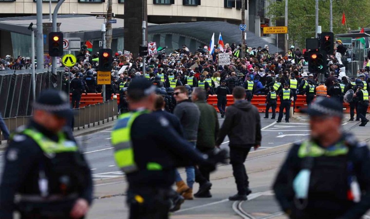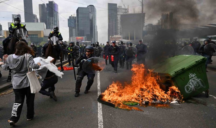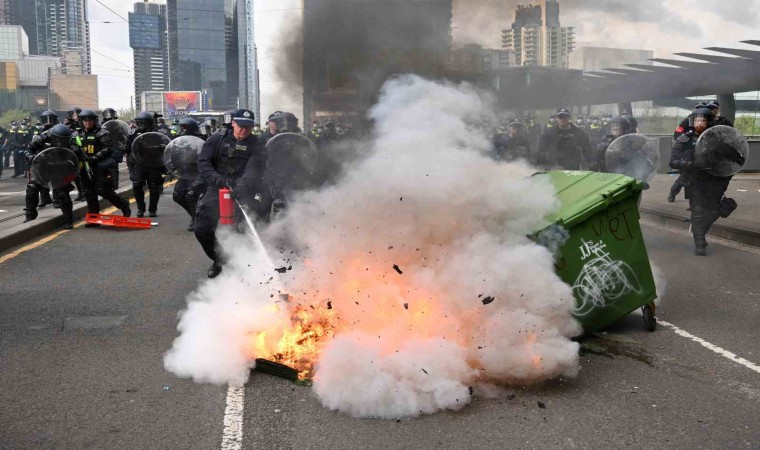 Avustralya’nın Melbourne kentinde Kara Kuvvetleri Uluslararası Kara Savunma Fuarı’nın gerçekleştirildiği Kongre ve Fuar Merkezi’nin önünde savaş karşıtı gösteri düzenlendi. Filistin yanlısı sloganlar atan göstericiler ve polis arasında çatışma çıktı. Polis tarafından yapılan açıklamada, şişe, taş ve at gübresi fırlatan göstericilerin polis memurlarına bazılarının asit olduğu belirlenen tahriş edici sıvı maddeler de sıktığı belirtildi. Açıklamada, göstericilerin fırlattığı cisimler ve sıktığı sıvılar nedeniyle 24 polisin yaralandığı ifade edildi. Polis göstericilere biber gazı, dikkat dağıtıcı cihazlar ve plastik mermilerle müdahale ederken, şu ana kadar 39 protestocunun saldırı, kundaklama ve yolların kapatılması gibi suçlar nedeniyle gözaltına alındığı açıklandı. Atlı polislerin de müdahalede bulunduğu gösterilerde, protestocular kurdukları barikatları ateşe verdi. Yaklaşık bin 200 kişinin katıldığı gösteride polis, bazı fuar katılımcılarının arbede sırasında yaralandığını belirtti.