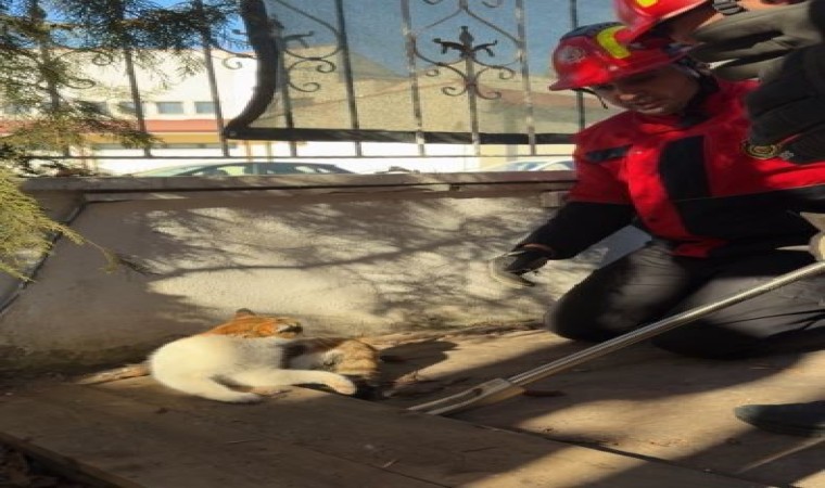 Sivas’ta ayağı tahtaların arasına sıkışan kedi, itfaiye ekiplerince kurtarıldı.