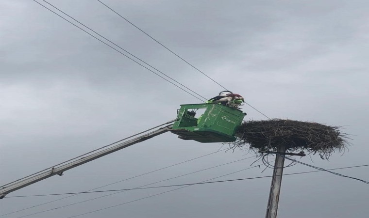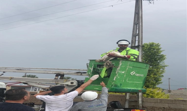 Iğdır merkez Evci köyünde elektrik direğindeki yuvasında ayağına ip dolanan leylek kurtarıldı.