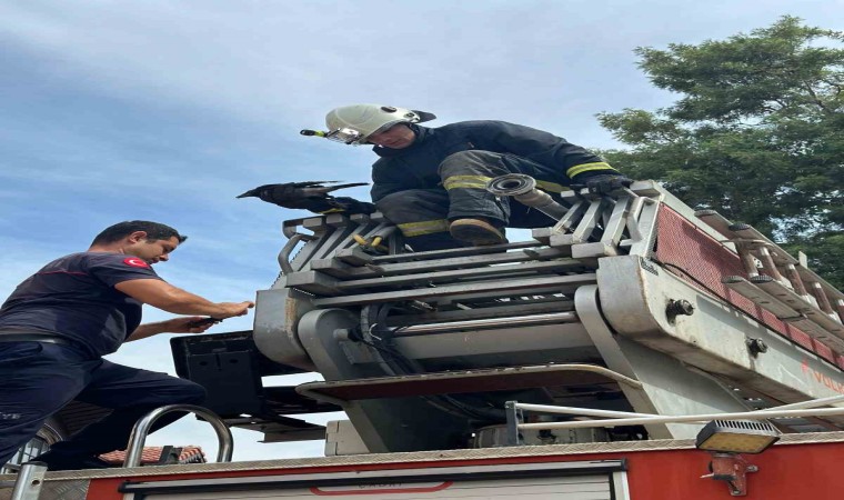 Antalya’nın Manavgat ilçesinde ayağına misina dolanıp ağaçta mahsur kalan karga, itfaiye ekiplerince kurtarıldı.