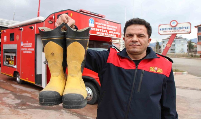 Kahramanmaraş’ta depremin yıktığı binanın enkazından kurtardıkları yaşlı adama ayağındaki botlarını çıkarıp giydirdiği görüntüleri gündem olan Merzifonlu itfaiyeci Kürşat Aydın, depremin sembolü o botlarını bir yıldır ayağına giymedi.