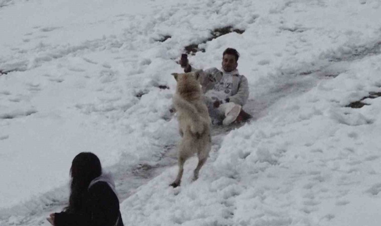 Rize’de, Ayder Yaylası’nda karda kayarak eğlenen gençlere eşlik eden çoban köpeği renkli görüntüler oluşturdu. Köpeğin üzerine doğru gelmesi ile korkan genç, köpeğin kendisiyle oyun oynadığını fark edince rahat bir nefes aldı.