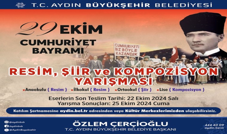 Aydın Büyükşehir Belediyesi, 29 Ekim Cumhuriyet Bayramı nedeniyle resim, şiir ve kompozisyon yarışması düzenliyor. “Cumhuriyet Bayramı” konulu yarışmada anaokulu, ilkokul, ortaokul ve lise öğrencileri eserleriyle yarışacak.