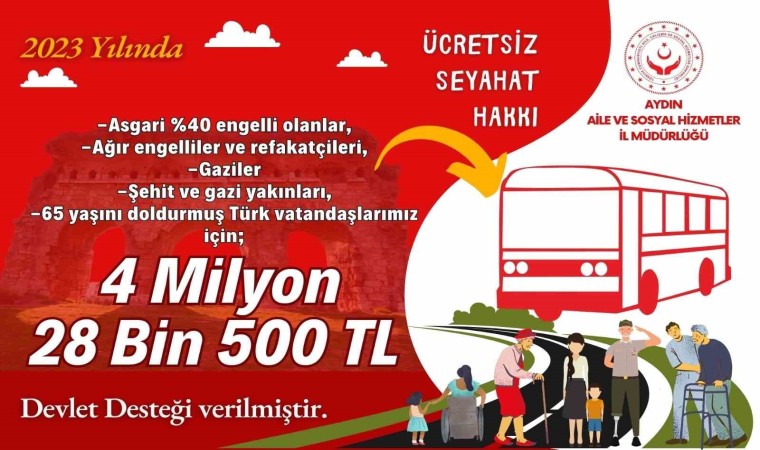 Aydın’da engelli, gazi, şehit, gazi yakını ve 65 yaş üstü vatandaşlar için hayata geçirilen ücretsiz seyahat desteği çerçevesinde 2023 yılında 4 milyon 28 bin 500 TL ödeme gerçekleştirildi.