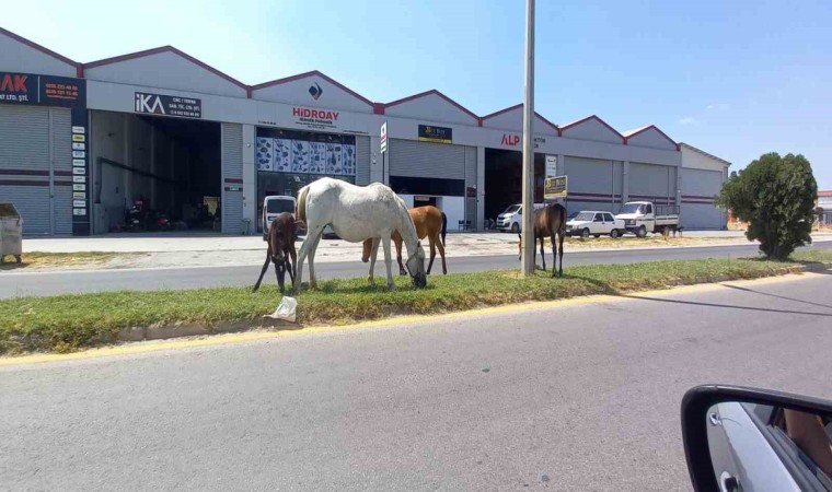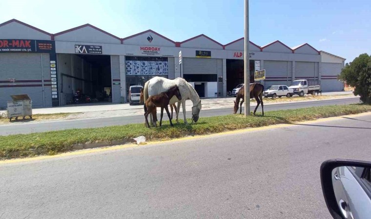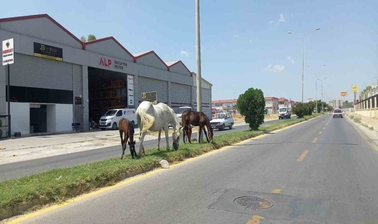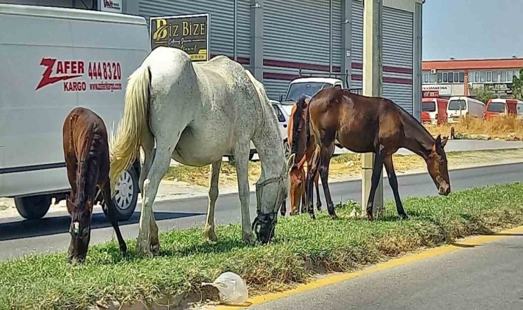 Aydın’ın Efeler ilçesinde karayollarında başıboş bir şekilde dolaşan atlar, yol kenarları ve refüjlerde otlarken, trafik kazalarına davetiye çıkarıyor.