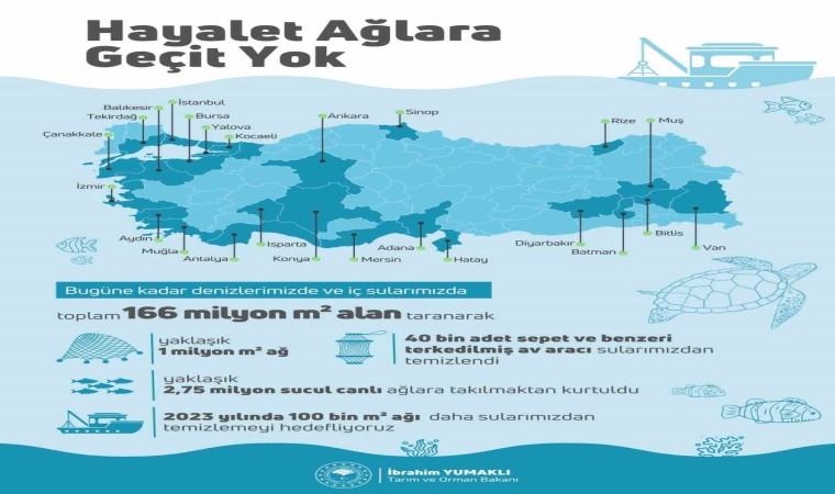 Tarım ve Orman Bakanı İbrahim Yumaklı, sosyal medya hesabından denizlerdeki ve iç sularda hayalet ağ temizliğine ilişkin paylaşımda bulunarak denizleri ve iç suları 150 futbol sahası büyüklüğündeki hayalet ağdan temizlediklerini kaydetti. Bakan Yumaklı’nın ’hayalet ağlara geçit yok’ diyerek yaptığı paylaşımında hayalet ağ temizliği yapılan Aydın’ın da aralarında bulunduğu şehirler, İstanbul, Bursa, Yalova, Balıkesir, İzmir, Muğla, Antalya, Çanakkale, Kocaeli, Tekirdağ, Adana, Mersin ve Hatay olarak açıklandı.