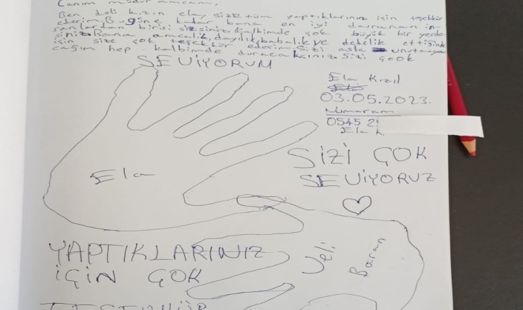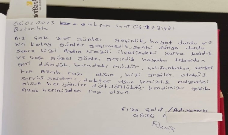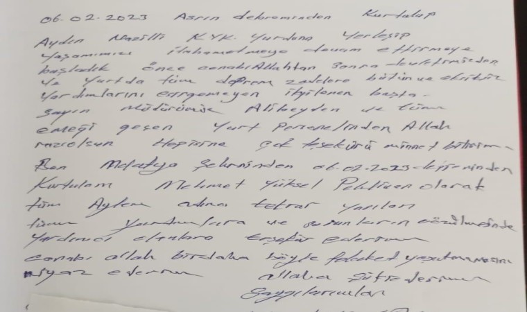 Depremzede vatandaşlardan Sibel Kızıl’ın bıraktığı notta “Müdür babamız, ilk geldiğimizde çok ama çok korkak ve çekinerek girmiştik. Sonra yavaş yavaş alışmaya çalıştığımız bu yurtta sevgi ve şefkatin var olduğunu gördük. Bir gün bile bizi yalnız bırakmayarak her zaman yanımızda ve her zaman yardımcı oldunuz. Çocuklarımız düştü kaldırdınız, ağlayınca susturdunuz. Ben böyle bir insan topluluğu hiç bir zaman bulamam ve unutmam. Çok, çok ama çok teşekkürlerimi sunarım. Allah razı olsun sizin gibi iyi insanlarla tanıştım. Hakkınızı helal etmenizi dilerim. Oğlum için yaptığınız her şey için Allah bin kere razı olsun” ifadeleri yer aldı.