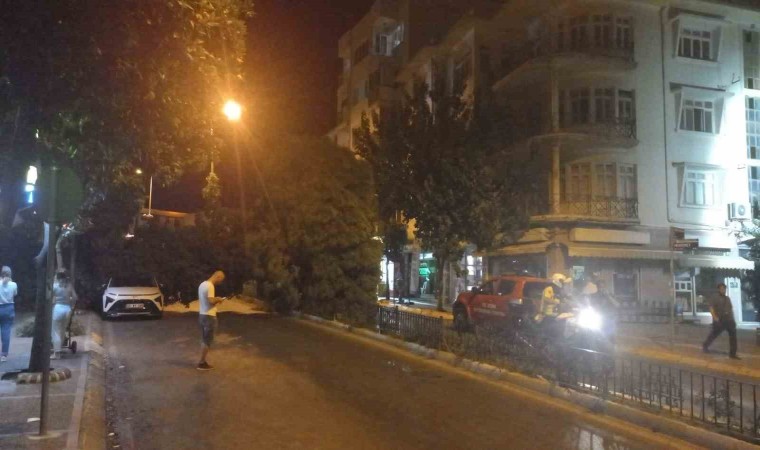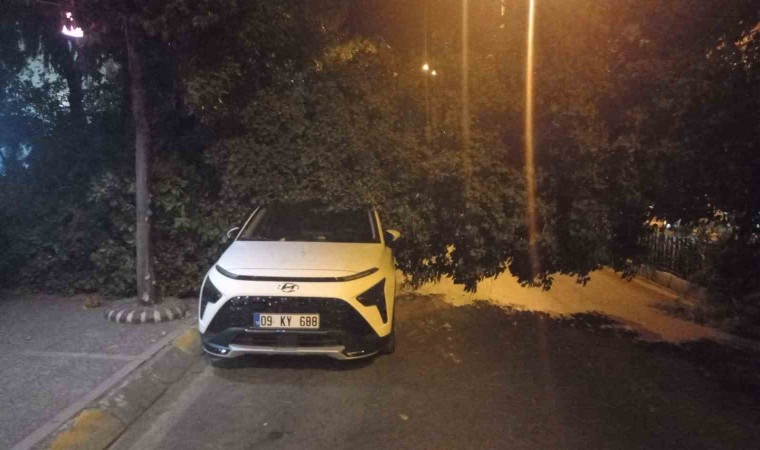 Aydın’ın Efeler ilçesinde devrilen ağaç park halindeki bir otomobile zarar verdi.