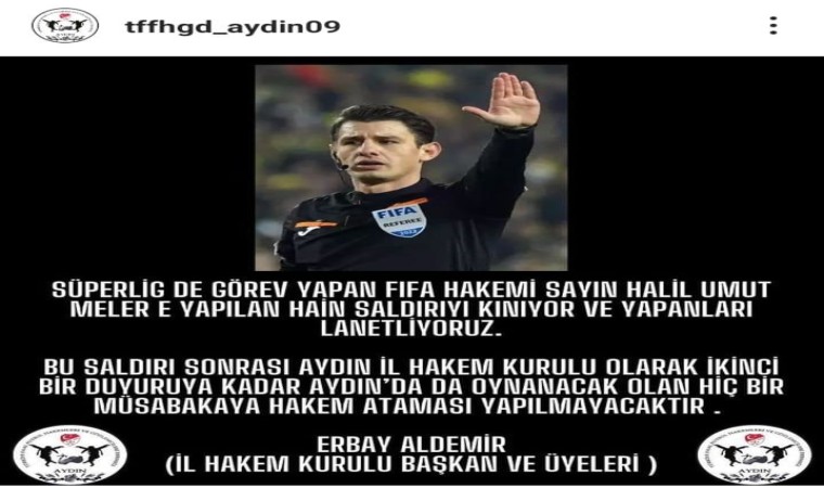 Süper Lig’in 15. haftasında Ankaragücü, sahasında Çaykur Rizespor ile 1-1 berabere kaldı. Mücadelenin bitiş düdüğünün ardından Ankaragücü Başkanı Faruk Koca, maçın hakemi Halil Umut Meler’e yumruklu saldırıda bulundu. Yaşanan olayın ardından Türkiye Futbol Federasyonu (TFF) tarafından alınan kararla liglere ara verildi. Yaşanan olayın yansıması Aydın’a da düşerken, Aydın İl Hakem Kurulu, Halil Umut Meler’e yapılan saldırının ardından kentte oynanacak karşılaşmalara bir sonraki duyuruya kadar hakem ataması yapmayacaklarını açıkladı. Yapılan açıklamada, “Süper Lig’de görev yapan FIFA Hakemi Halil Umut Meler’e yapılan hain saldırıyı kınıyor ve yapanları lanetliyoruz. Bu saldırı sonrası Aydın İl Hakem Kurulu olarak ikinci bir duyuruya kadar Aydın’da oynanacak olan hiçbir müsabakaya hakem ataması yapılmayacaktır” ifadeleriyeraldı.