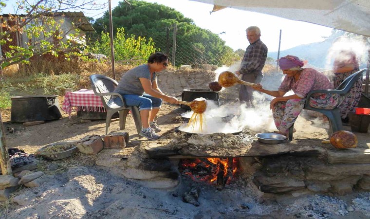 Aydın’ın önemli pekmez üretim merkezlerinden biri olan Koçarlı ilçesinin Beşparmak Dağları eteklerindeki Bağcılar Mahallesi’nde, yeni sezonun pekmez üretimi için ocaklar yakıldı. Kış aylarının vazgeçilmez lezzetlerinden biri olan ve şifa kaynağı olarak bilinen pekmez için, üzümler toplandı ve iki gün sürecek üretim süreci başladı.
