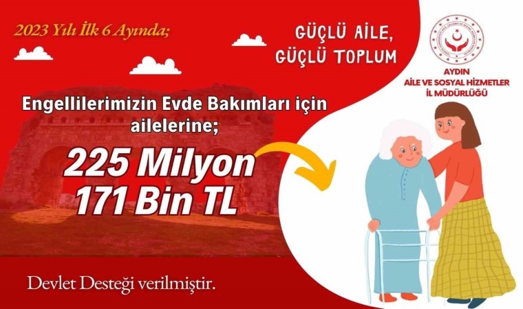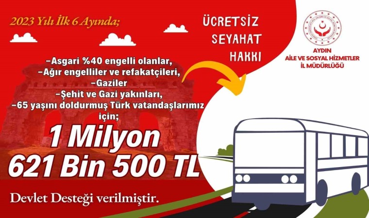 Ücretsiz Seyahat Hakkı çerçevesinde Aydın’da 2023 yılı ilk 6 ayında, asgari yüzde 40 engelli olanlar, ağır engelliler ve refakatçileri, gaziler, şehit ve gazi yakınları, 65 yaşını doldurmuş Türk vatandaşları için 1 milyon 621 bin 500 TL devlet desteği verildi. Güçlü Aile Güçlü Toplum anlayışıyla engellilerin evde bakımları için 225 milyon 171 bin TL devlet desteği verildi. Doğum Yardımı çerçevesinde tüm annelere 1 milyon 253 bin TL ödeme yapıldı. Sosyal ve Ekonomik Destek (SED) Hizmeti çerçevesinde ise 31 milyon 260 bin TL devlet desteği verildi.