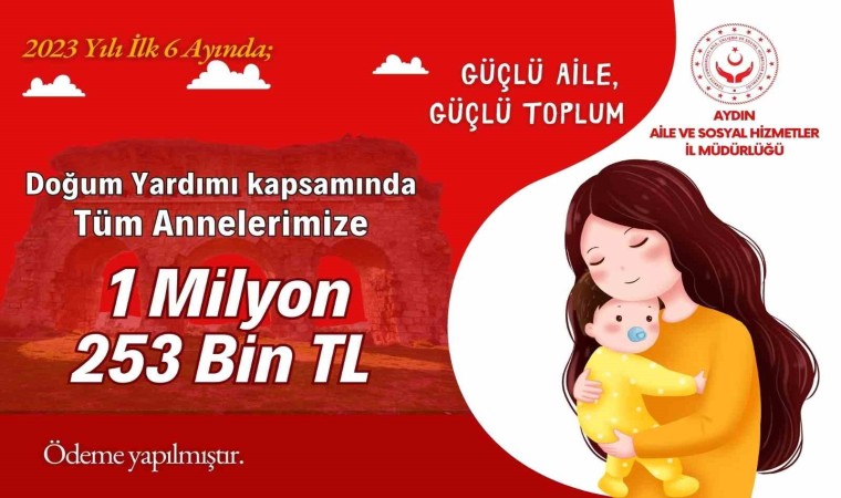 Aydın Aile ve Sosyal Hizmetler İl Müdürlüğü verilerine göre il genelinde 2023 yılının ilk 6 ayında ücretsiz seyahat hakkı, engelli bakımı, doğum yardımı ve SED hizmeti olmak üzere toplamda 259 milyon 305 bin 500 TL devlet desteği sağlandı.