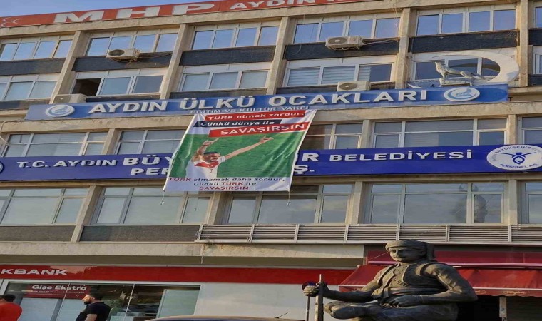 Avusturya maçında attığı golü ’bozkurt’ işareti yaparak kutlayan Türkiye Milli Takım oyuncusu Merih Demiral’ın UEFA’dan 2 maç ceza alması üzerine Aydın Ülkü Ocakları Başkanlığı astığı pankartla Demiral’a destek mesajı verdi.
