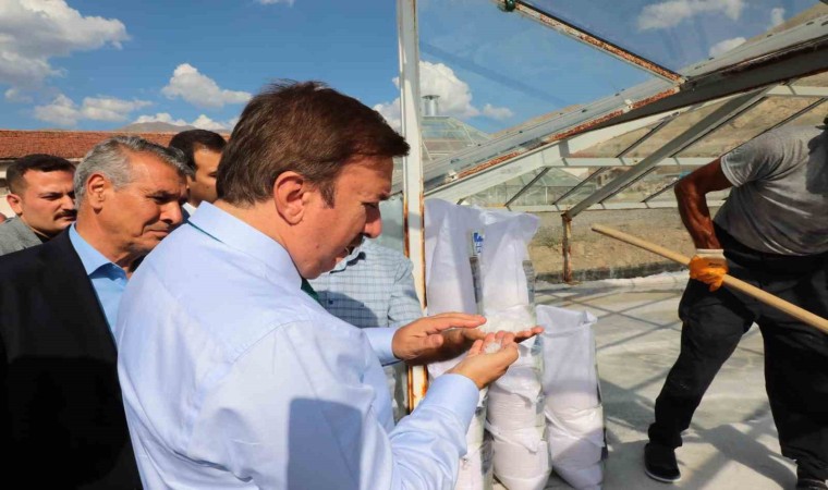 Erzincan’ın coğrafi işaret tescil belgeli Kemah tuzunun üretimi hakkında bilgi alan Hamza Aydoğdu, üretim tesisi işletme sahibi Metin Tanrıkulu ile çalışanlara bereketli bir sezon temenni ederek kolaylıklar diledi.