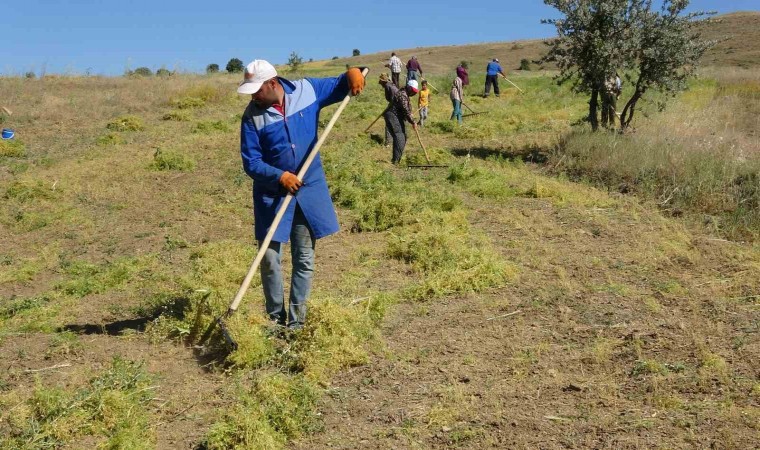 Türkiye’de yeşil mercimek üretiminde ilk sıralarda yer alan Yozgat’ta çiftçiler, hasat sezonunu açtı. Kimi çiftçi makine yardımıyla yeşil mercimek hasadı yaparken, kimileri de geleneksel yöntemlerle tırpan yardımıyla hasat yapıyor. Teknolojinin gelişmesiyle birlikte sayıları günden güne azalan ve geçimlerini tırpan işiyle sağlayan işçilerin de yeşil mercimek hasadıyla birlikte zorlu mesaileri başladı. Sabahın erken saatlerinde işe başlayan tırpan işçileri, 30 dereceyi bulan sıcak havanın altında çalışmaya devam ediyor. Günlüğü bin 500 lira yevmiye ile çalışan tırpan işçileri, Yozgat’ın merkeze bağlı Çalatlı köyünde bereketli topraklarda rızıklarını çıkarıyor.