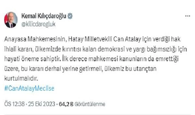 CHP Genel Başkanı Kemal Kılıçdaroğlu, AYM'nin Can Atalay için verdiği hak ihlali kararına ilişkin sosyal medya hesabından paylaşım yaptı. Kılıçdaroğlu, "Anayasa Mahkemesinin, Hatay Milletvekili Can Atalay için verdiği hak ihlali kararı, ülkemizde kırıntısı kalan demokrasi ve yargı bağımsızlığı için hayati öneme sahiptir. İlk derece mahkemesi kanunların da emrettiği üzere, bu kararı derhal yerine getirmeli, ülkemiz bu utançtan kurtulmalıdır" ifadelerini kullandı. (DHA)