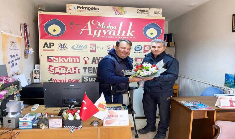 Bölgenin tanınmış haber muhabiri Salgın’ı bürosunda ziyaret eden Ayvalık Polisi; engelli muhabirin 3 Aralık Dünya Engelliler Günü’nü çiçeklerle kutladı.