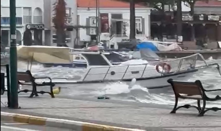 Balıkesir’in Ayvalık ilçesinde etkili olan yağışlı hava ve fırtına nedeniyle rıhtımda balıkçı tekneleri battı, bir ağaç devrildi.