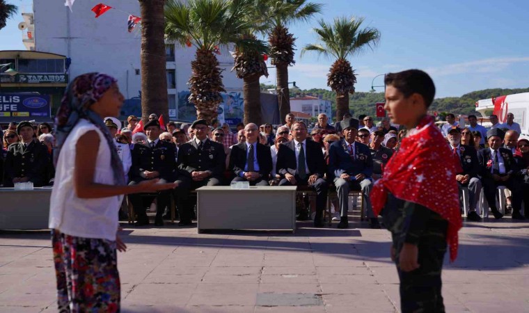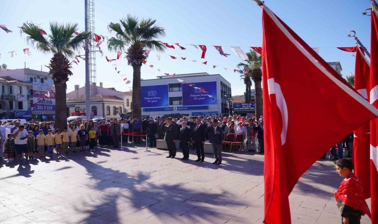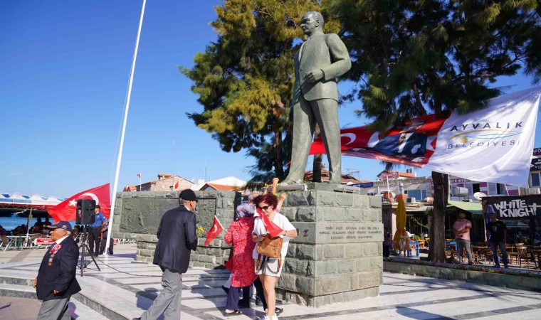 Türkiye Muharip Gaziler Derneği Ayvalık temsilcisi Mehmet Kıranoğlu ile yönetim kurulu üyelerinin Atatürk anıtına çelenk sunmasının ardından tören saygı duruşu ve İstiklal Marşı’nın okunmasıyla devam etti.