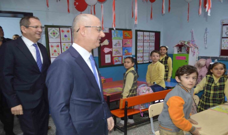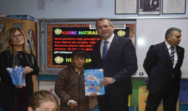 Minik öğrencilere karnelerini dağıtan Kaymakam Hasan Yaman ile Belediye Başkanı Mesut Ergin’in sempatik tavırları öğrencileri mutlu etti.