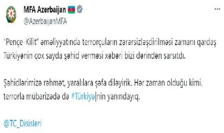 Azerbaycan Dışişleri Bakanlığı’ndan yapılan açıklamada, “Kardeşimiz Türkiye'nin Pençe-Kilit Harekatı’nda teröristlerin etkisiz hale getirilmesi sırasında şehit verdiği haberi bizi derinden sarstı. Şehitlerimize rahmet, yaralılarımıza şifa diliyoruz. Terörle mücadelede her zaman olduğu gibi Türkiye'nin yanındayız” denildi.