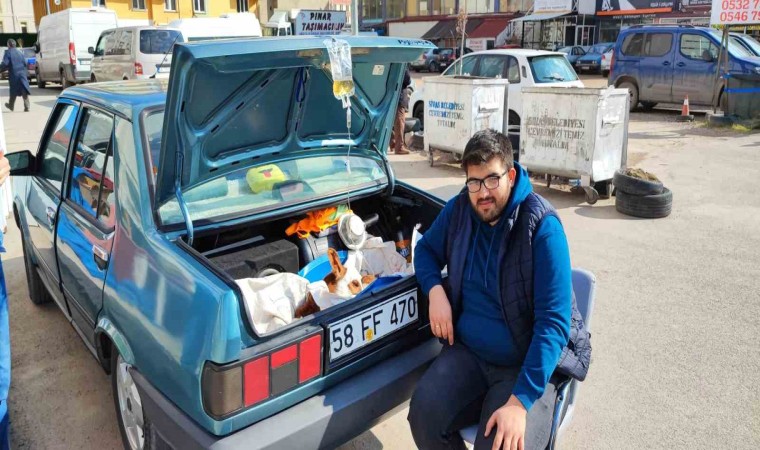 Sivas’ta yaşayan Ömer Çiftçi, üşütüp hastalanan 4 günlük buzağısını otomobilinin bagajında veterinere götürdü. Veterinerde tedavisi yapılan buzağıya bagajda serum takıldı, aynı zamanda güneşte kalması sağlandı. Bagajda hem güneşlenen hem de sahibinin parmağını emen buzağı yüzleri gülümsetti. Bir süre bagajda güneşlenen baygın haldeki buzağı, serumun bitmesini ardından kendine gelerek ayaklandı.