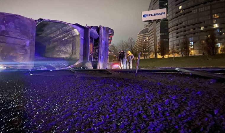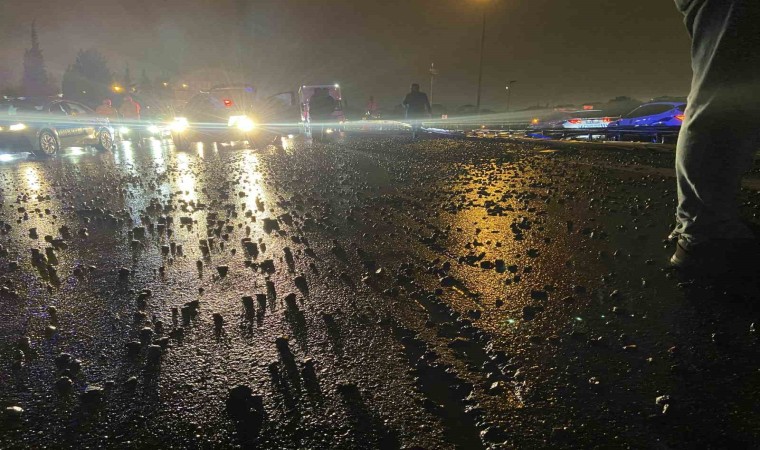Bağcılar TEM Otoyolu’nda mıcır yüklü hafriyat kamyonu bariyerlere çarparak yan yattı. Kamyon sürücüsü olayda yara almazken kamyondaki mıcırlar yolun iki her iki tarafına döküldü.