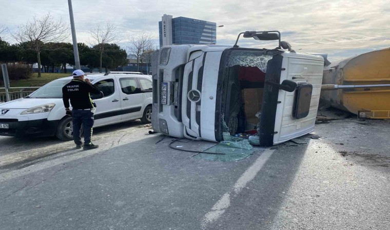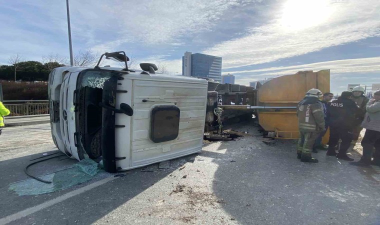 Bağcılar’da, sürücünün kontrolünden çıkan toprak yüklü hafriyat kamyonu devrilirken kazada yaralanan sürücü hastaneye kaldırıldı.