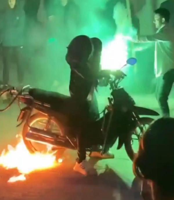 Motosiklet de alevler içinde kaldı. Arka tekeri ateşin içinde patinaja devam eden sürücüye yükselen alevler sıçradı. Ayakkabısı ve kıyafeti yanmaya başlayan sürücü motosikletin üzerinden inip ateşi söndürmeye çalıştı. Alevlerin üzerinde kalan motosikleti de toplanan kalabalıktan bazıları kenara çekti. Korku dolu anlar cep telefonu kamerasıyla kaydedildi. (DHA)